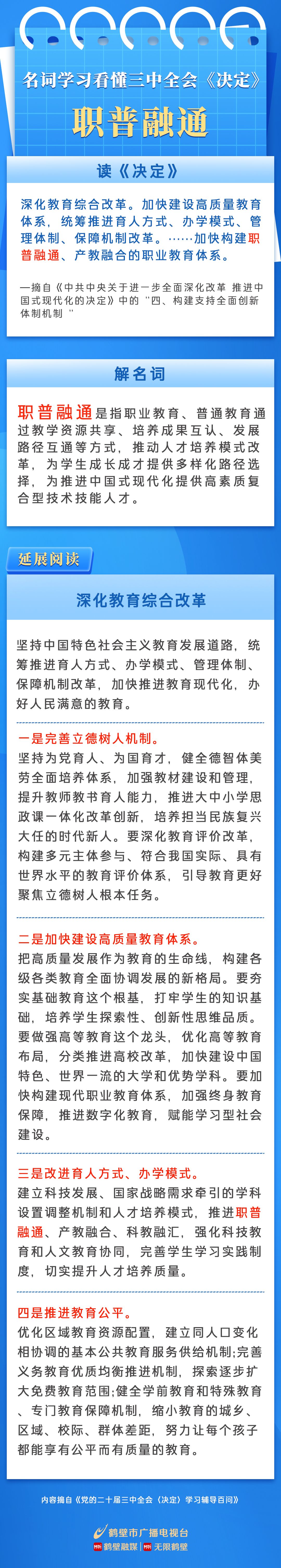 党的二十届三中全会审议通过了《中共中央关于进一步全面深化改革、推进中国式现代化的决定》。依据《党的二十届三中全会〈决定〉学习辅导百问》,制作三中全会《决定》系列名词卡片,和大家一起来深入学习领会二十届三中全会精神。本期名词是“职普融通”。