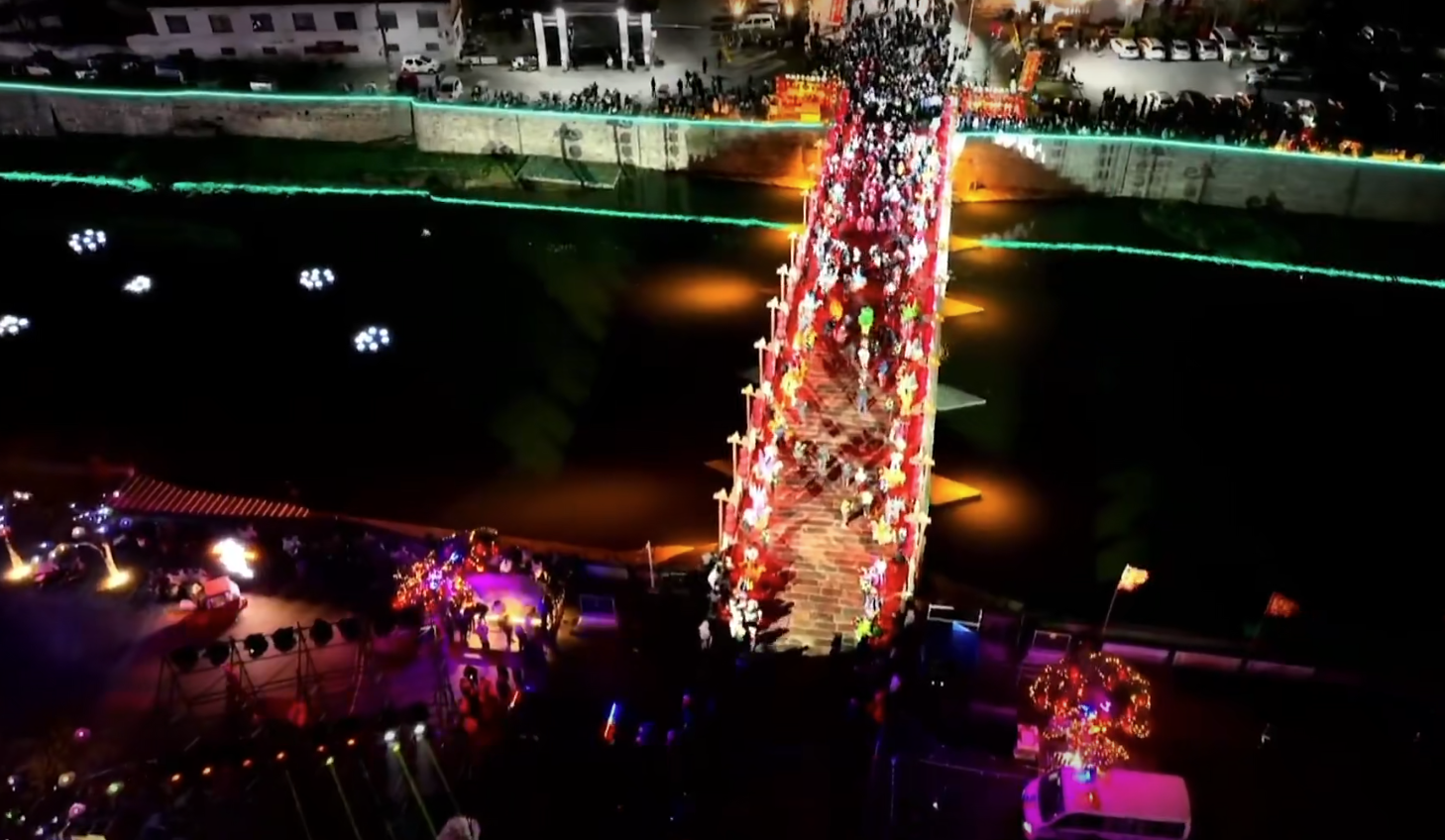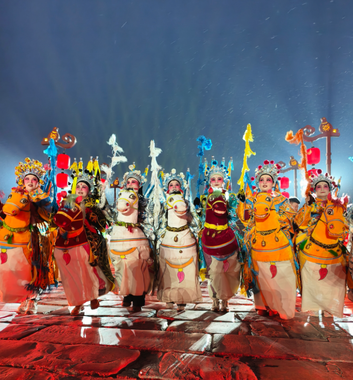 嘉宾们踏着青石板路昂首而来,跨过云溪桥。桥两侧,非遗打铁花如流星划破夜幕,欢腾的竹马与舞狮的鼓点交织成热烈乐章,千年古城的烟火气扑面而来。嘉宾们穿过这幅活态的非遗长卷,一同奔赴这场“东方狂欢节”。